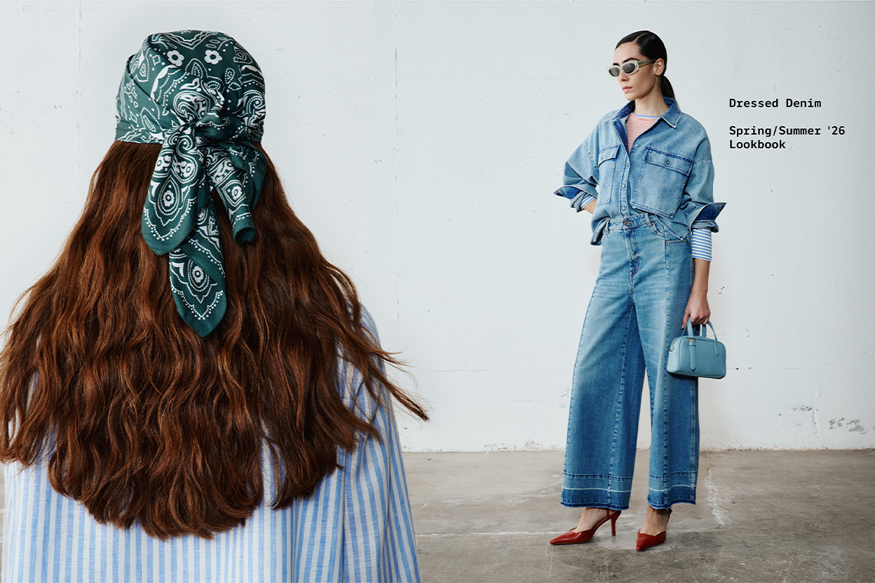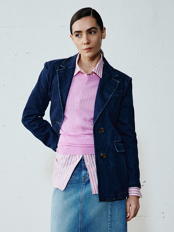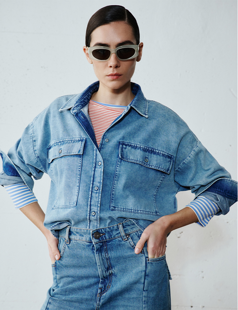 Scopri l’incontro tra il delavé chiarissimo e il blu profondo, tra giacche boxy e gonne midi con spacco frontale. Giochi di sovrapposizioni e texture per un look deciso.