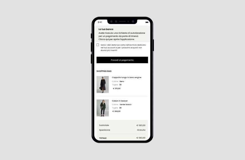 La tua esperienza di shopping resterà sempre veloce e sicura, dovrai semplicemente confermare la tua identità ogni volta che effettuerai un pagamento online inserendo ad esempio un codice temporaneo o utilizzando la tua impronta digitale sulla app della tua banca.